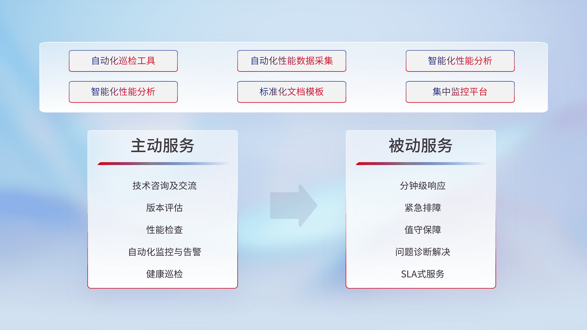 智能化工具和标准化文档,,,,保障服务质量,,,提供主动服务(包含技术咨询、、、、版本评估、、性能检查、、、自动化监控与告警、、、健康巡检)和被动服务包含(分钟级响应、、、、紧急排障、、值守保障、、、问题诊断解决、、SLA服务)。。。。